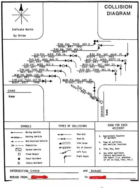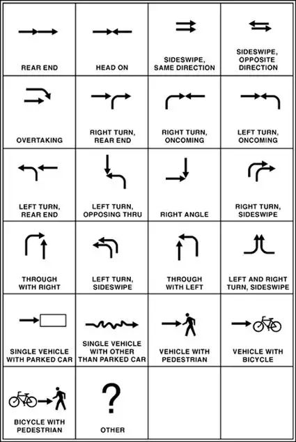 与国内略有不同,美国交通事故记录中关于碰撞方式有更细致的区分,除了常见的追尾、迎头相撞等,还会根据来车方向不同做更具体的划分,方便查看事故记录时能快速、清楚地知道事故碰撞的形式及车辆行驶方向。
