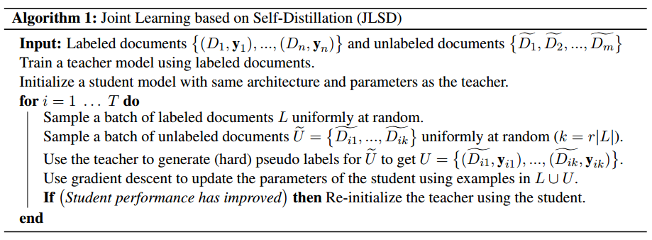 图 3描述了提出的 JSLD算法。其中, T表示训练迭代次数, r是超参数,它确定每次迭代中要采样多少未标记的文档, D代表文档, y是对应的标签。