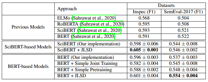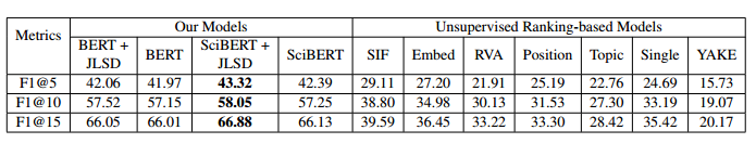 本文实现了两个具有不同预训练上下文嵌入的基线模型: BERT( base-cased)和 SciBERT( scivocab-cased)。并且分别与有监督的方法(表 1, Inspec和 SemEval-2017数据集)、无监督的方法(表 2, Inspec数据集)以及与其他迁移学习技术的比较(表 1, simple pretraining 、 simple joint training),实验结果显示,通过应用本文提出的联合学习方法( JLSD),可以不断提高基线模型的性能。
