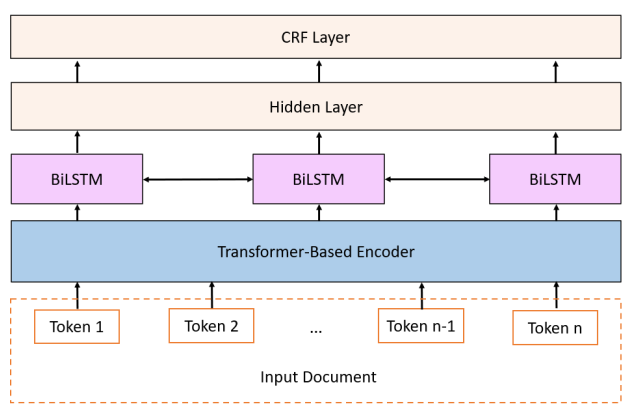 本文将 BiLSTM-CRF 架构用作基准架构 ,图 1显示了基线模型 层次 概述。给定一系列输入 tokens ,模型首先使用基于 Transformer 的编码器为每个 token 形成上下文表示 ,并且在基于 Transformer 的表示之上进一步使用了双向 LSTM ,之后,使用全连接层将双向 LSTM 的输出映射到标签空间。 最后,将线性链 CRF 应用于解码标签。