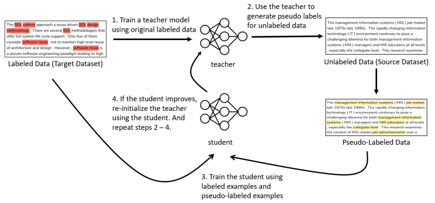 首先使用带标签的样例训练 teacher模型。之后,开始训练参数化与 teacher模型相同的 student模型。在每次训练迭代中,都会对一批原始标签样例和通过 teacher模型对没有标签样例生成的伪标签进行抽样。