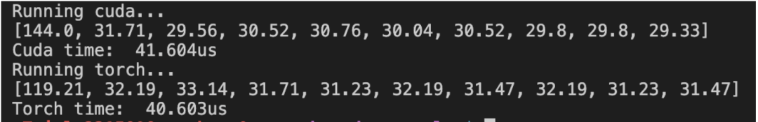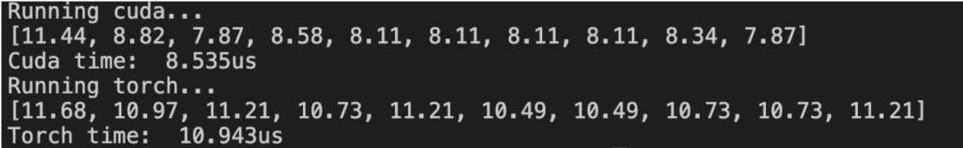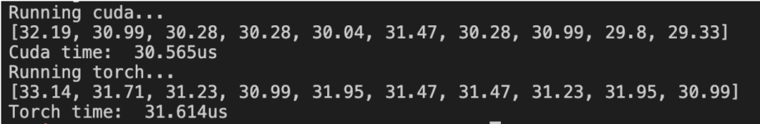 这里我们torch和cuda分别执行10次看看平均时间,此外执行前需要先执行10次做一下warm up,让GPU达到正常状态。