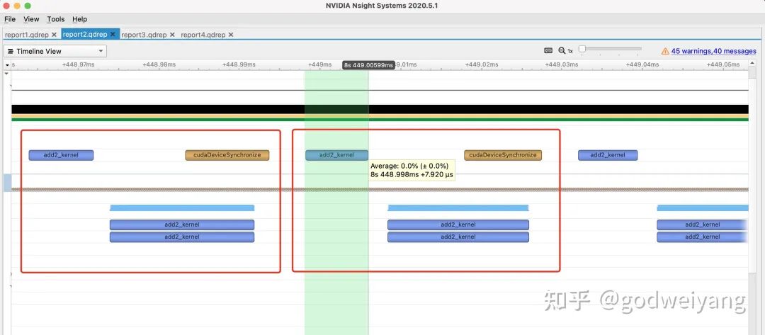 其中第1和第3个框分别是cuda和torch的GPU warm up过程,这部分没有进行线程同步(上面的黄色块)。