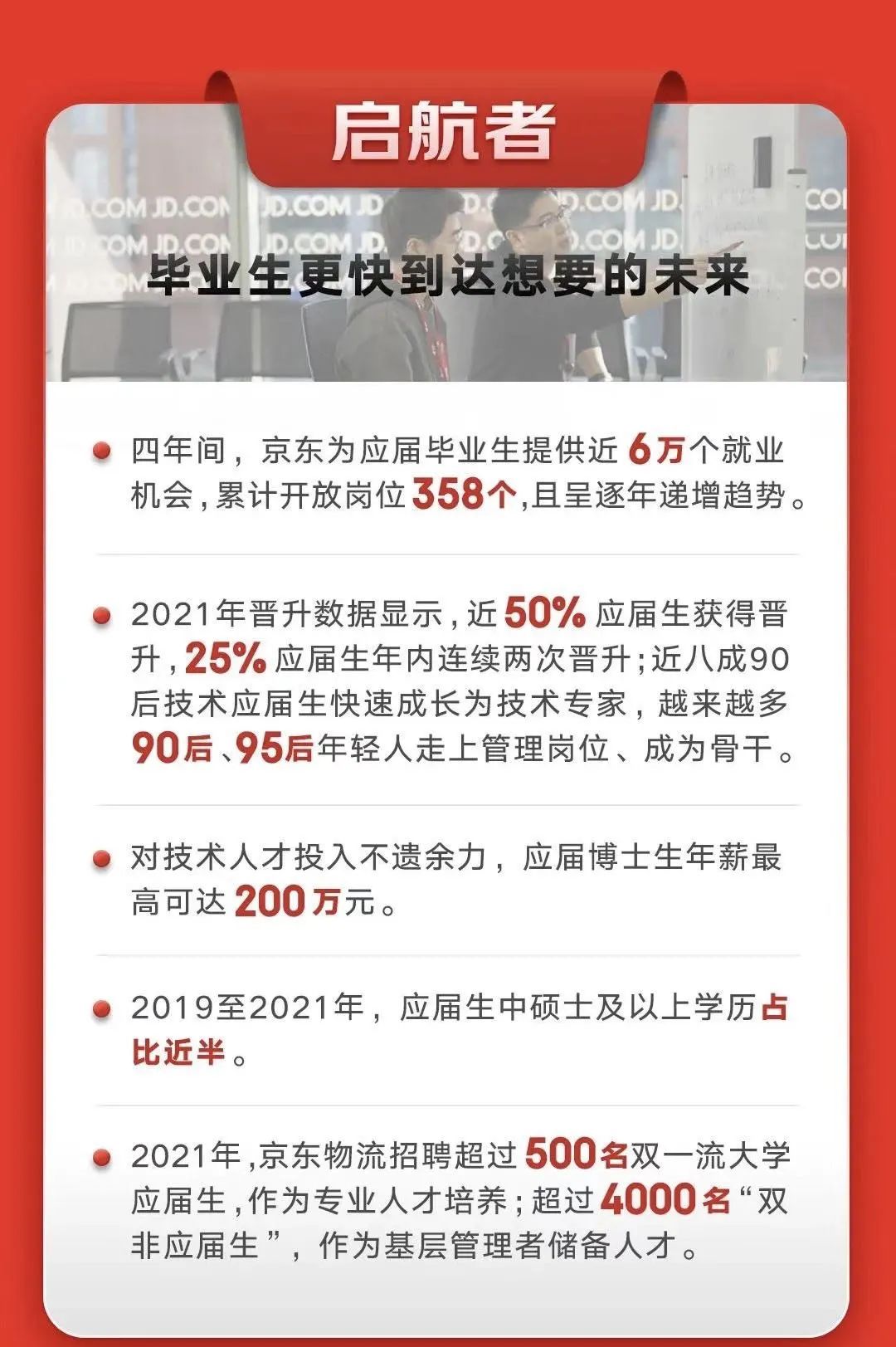 京东数据显示,京东物流一线员工中超过80%来自农村地区。一线员工中在本省就业的人数占比超过60%。2021年近50%应届生获得晋升,25%应届生年内连续两次晋升。应届博士生年薪最高可达200万元。