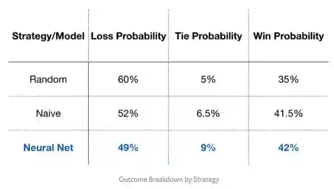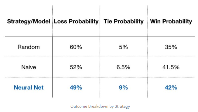 让我们看看神经网络是否找到了更优的策略。下表展示了各种策略类型的结果分布。从中我有两个发现:首先,我们的神经网络仅输掉了不到一半的游戏(49%)。 虽然很难说我们会最终获胜,但对于一场赔率固定的游戏来说,这是相当不错的结果了;其次,神经网络实际上并不比会比朴素策略带来更多的胜局,而是能够更频繁地将对手逼成平局。