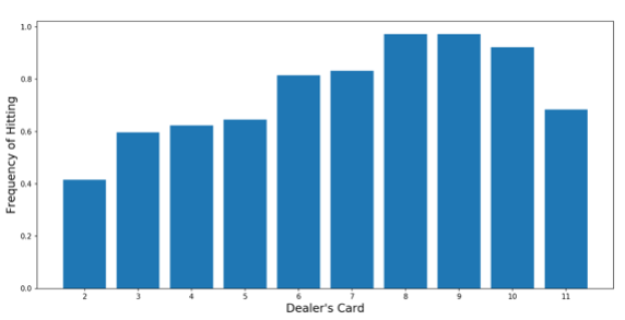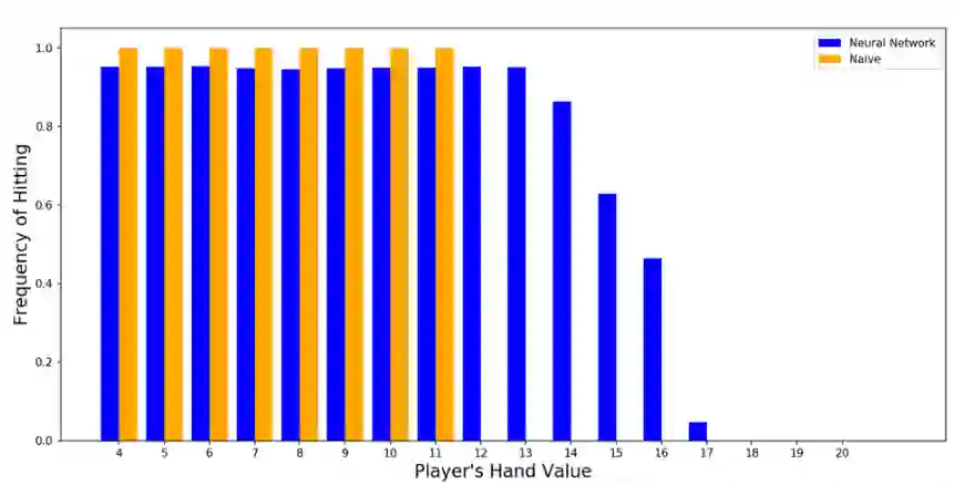 当庄家的明牌点数较大(8、9或10)时,神经网络非常倾向于拿牌。但即使庄家的明牌点数较小(例如3),神经网络在60%的情况下仍然选择拿牌,这是因为神经网络在做出决定时会考虑其可使用的所有特征。因此,我们无法轻易将其决策提炼为一些简单的经验法则。