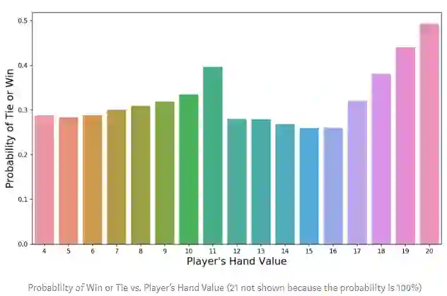 获胜或平局的概率随玩家初始手牌总点数的变化(柱形越长概率越大!)
