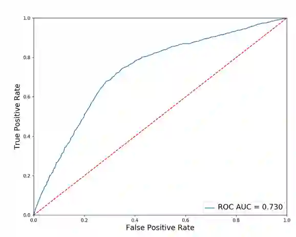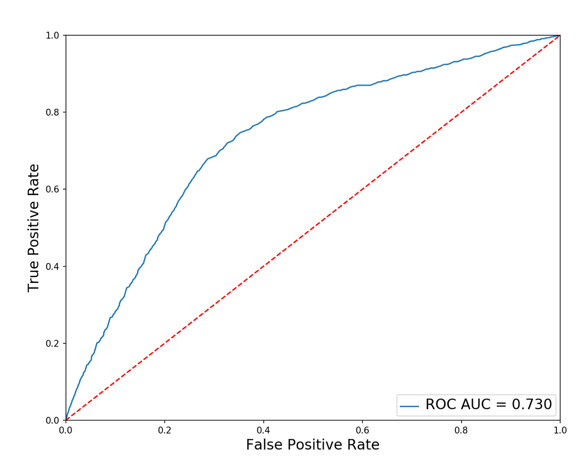 下图是我们的21点神经网络的ROC曲线 —— 这看上去似乎比随机猜测(红色虚线)要好不少。曲线下的面积,即AUC,达到0.73是明显高于随机猜测的AUC(0.5)。