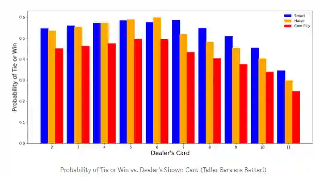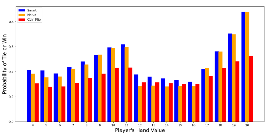 我们还可以看看获胜或平局的概率如何随玩家初始手牌的总点数而变化。结果看起来非常棒,无论玩家初始手牌的总点数是多少,和另外两种策略相比,我们的神经网络都能表现一样好甚至更好。 反观朴素策略, 它在绝望之谷(玩家初始手牌的总点数介于12到16之间)的表现甚至不如随机策略。毫无疑问,神经网络具有更佳的表现。