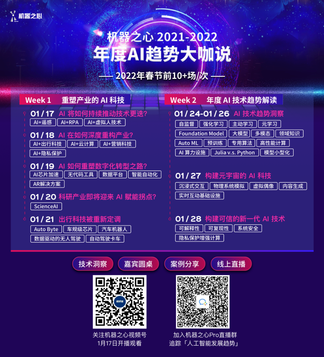 2021 年 2 月 1 日至 9 日期间,机器之心发起首届「年度 AI 趋势大咖说」暨「机器之心 Pro · 人工智能 2020 年度回顾与 2021 趋势前瞻」特别策划,携手二十七位耳熟能详的 AI 重磅专家通过线上直播的方式进行了为期 5 天的精彩分享,通过主题分享及多人圆桌等形式,解读涵盖 AI 科研、AI 产业融合及智能制造、智慧城市、数字新基建等十多个年度热点性领域的智能化发展趋势累计超过 20 万的直播关注,并同期联合百度科技发布视频节目《AI Talks》,携超过五十万观众畅游人工智能产业的过去、现在和未来,探讨 AI 带给社会的变革与机遇。 作为「与 AI 俱进,化时光为翎」机器之心 2021-2022 跨年特别策划中的重要组成部分,「机器之心 2021-2022 年度 AI 趋势大咖说」聚焦「驱动未来的 AI 技术」与「重塑产业的 AI 科技」,推出线上分享,邀请行业精英、读者、观众共同,回顾 2021 年中的重要技术和学术热点,盘点 AI 产业的年度研究方向以及重大科技突破,展望 2022 年度 AI 技术发展方向、AI 技术与产业科技融合趋势。 1000 分钟精彩不停歇,透视 AI 技术,畅聊 AI 融合的新一代产业科技 本次线上分享会为期两周,分为两个主题周,第一周主题为「重塑产业的 AI 科技」,将于 2022 年 1 月 17 日——2022 年 1 月 21 日期间分为五期进行,来自博世中国、小冰公司、大地量子、实在智能、天壤智能、来也科技、亮亮视野等近 20 家企业的大咖嘉宾将分别做客「机器之心 2021-2022 年度 AI 趋势大咖说」直播间,围绕「技术升级」、「产业革新」两大方向,「企业 IT」、「AI for Science」、「智能驾驶与出行」等三大人工智能重点应用产业的发展趋势,尽可能的呈现 AI 未来的发展脉络。