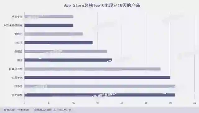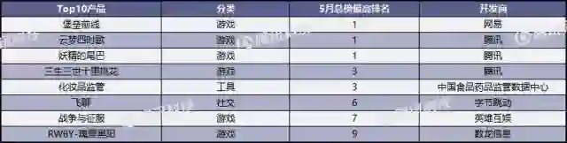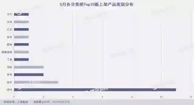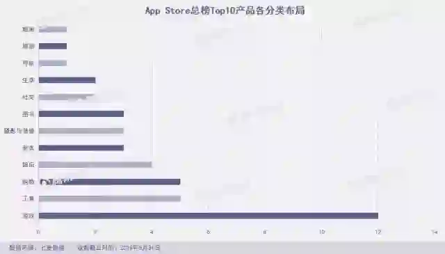 5月份,在总榜Top10共出现过42款产品,其中,游戏类产品有12款,工具类和购物类分别出现过5款产品。