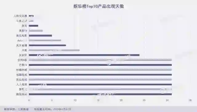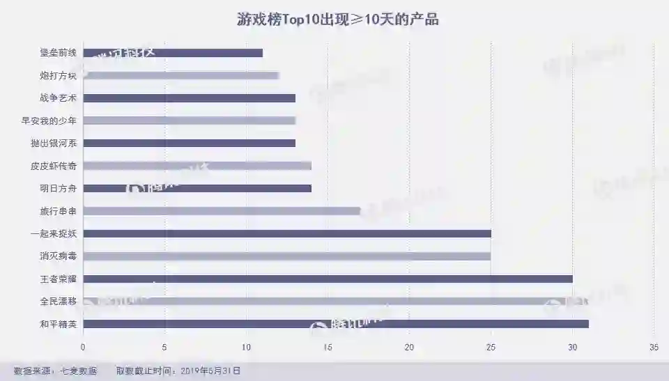 有36款产品出现在5月游戏榜Top10,腾讯旗下“和平精英”、“王者荣耀”、“一起来捉妖”出现超过20天。