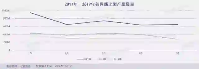 虽然同比2017年5月(6.5万)新上架产品数量下滑38%,但同比2018年5月(2.7万)上涨近46%,同等月份上新数量首次超越2018年。