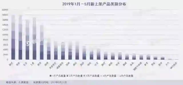 2019年,各类别产品在1月~5月新上架的数量较为均衡。
