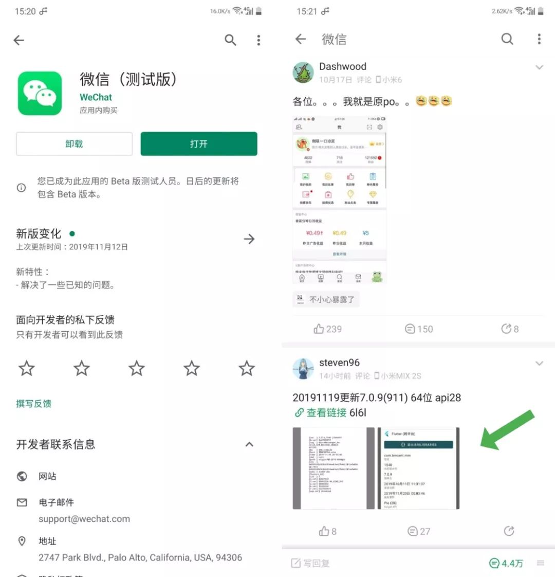我们可以在 Google Play 商店上获得 64 位的微信,也可以在酷安的微信评论区里面获取其他用户分享的 64 位版本微信 APK 安装包(能够直接安装表示签名相同,也就是 Play 商店原版的微信)。