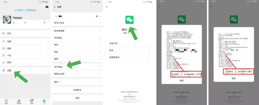 在微信设置的关于微信界面里面,点击微信图标两下即可看到微信的详细版本信息,如果底下「eabi」的值是「armeabi-v7a」表示你正在使用 32 位的微信,如果「eabi」的值是「arm64-v8a」那么表示你正在使用 64 位的微信。