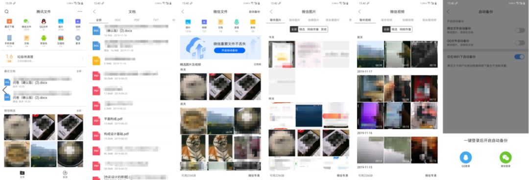 另外腾讯文件还有微信小视频和图片精选功能,会推荐一些微信缓存的图片与视频(不是主动保存下载的图片与视频,是从微信缓存文件夹里提取的)方便发现之前没有保存过的图片与视频。在此基础之上,腾讯文件更是提供了微信文件自动备份功能,可以自动将微信文件备份到微云。