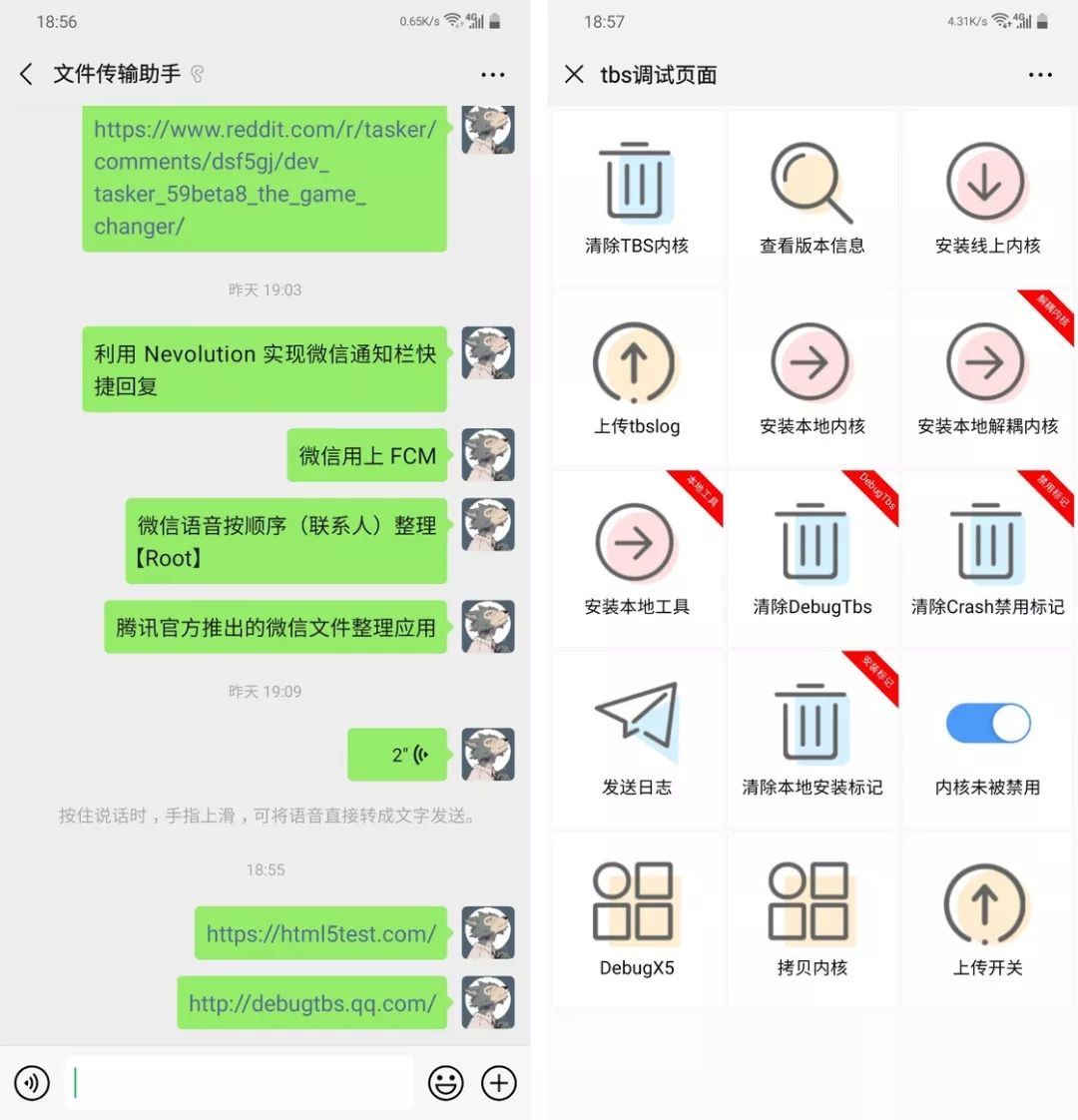 更改方法也非常简单,在微信任意对话框内输入网址 http://debugtbs.qq.com/(注意是 http:// 而不是 https://)然后发送出去,推荐发送到文件传输助手,接着在微信内打开这个网址,即可进入微信的 tbs 内核调试页面: