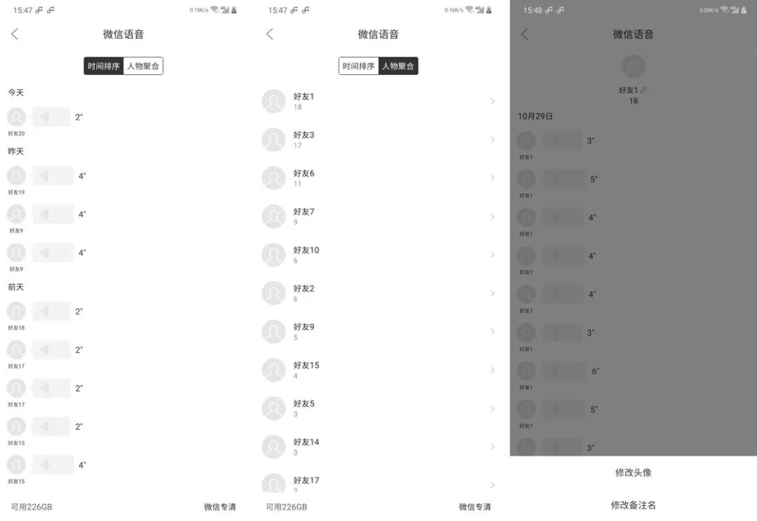 腾讯文件自带微信语音管理:点击应用首页的「微信文件 - 语音」,就可以看到所有人的微信语音了,点击单条微信语音可以直接播放。默认是按照时间顺序排列,不会显示用户名称(微信本身限制,语音是用户名加密后存放在本地的),但是提供了按用户分类微信语音,可以自己根据听到的声音在用户头像那里设置备注,算是比较简单直接的微信语音管理。