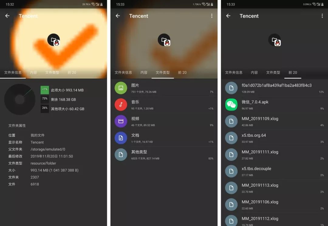 腾讯文件可以很方便地,找到最近的微信文件,默认也提供了根据图片、文档、视频、语音、其他方便的微信文件分类。虽然现在很多国产的文件管理器都提供了这项功能,都不如官方的腾讯文件来得精准和方便。