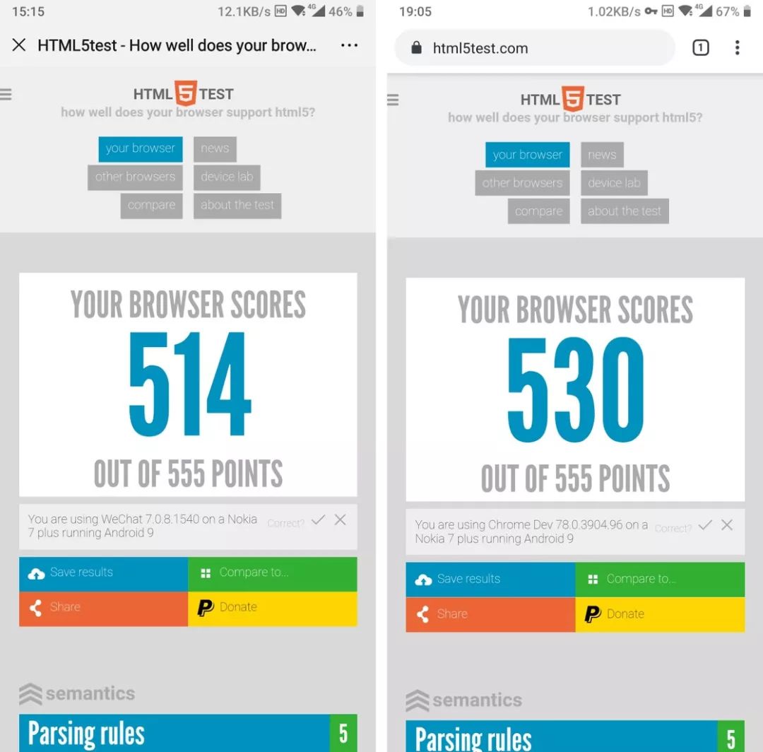 其实这就是因为国内版微信使用了腾讯自家的 X5 浏览器内核。X5 内核是由开源的 Chromium 内核魔改而来,所以一般来讲 X5 内核的版本会比新系统手机里面的系统 Webview 内核版本落后不少,而且魔改的很多地方会导致性能与兼容性问题。(顺便说一句,之所以要使用自制 X5 内核是之前是为了保证新旧手机都有一致的体验,现在则可能为了能够热更新以及插入私有 API。)