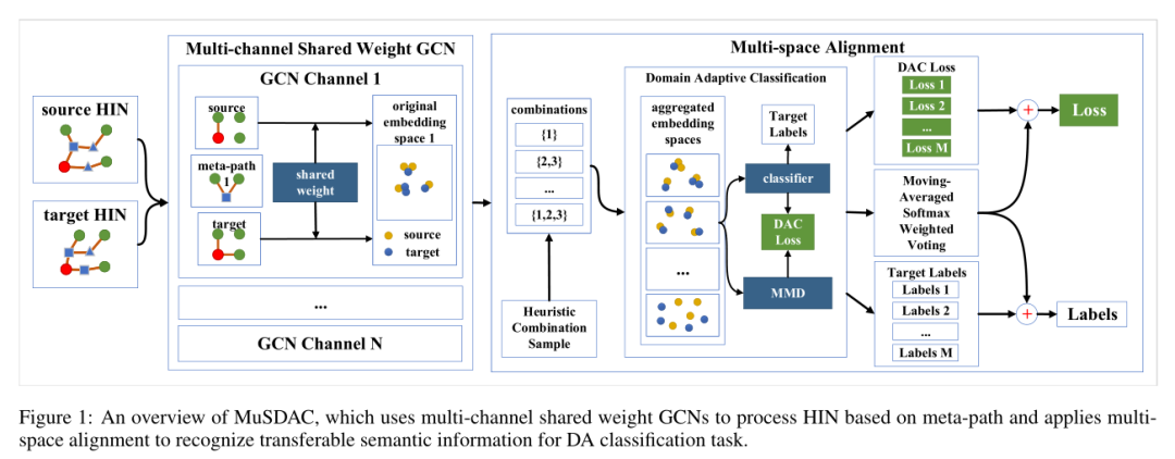 MuSDAC 采用多通道共享权重 GCNs 进行基于元路径的 HIN 处理,采用多空间对齐识别 DA 分类任务的可迁移语义信息。