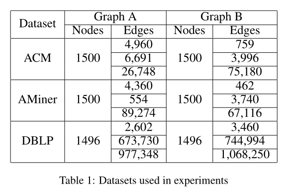 分别从 ACM、AMiner 和 DBLP 中抽出结构不同的图对。表1列出了这些数据集的统计数据,因此显示了它们的结构差异。对于每对图,元路径边的密度彼此之间差别很大,这表明这些图对是域兼容的(即结构上不相似)。