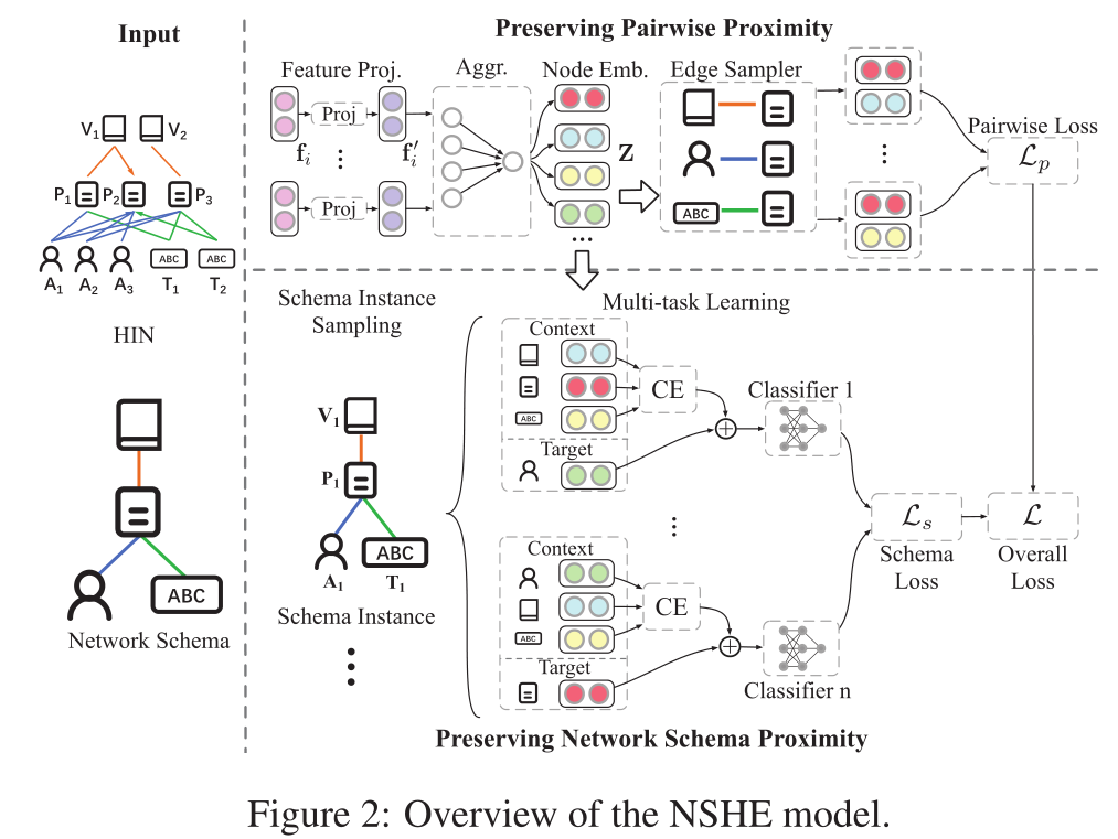 网络模式全面包含了 HIN 的高阶结构以及丰富的语义。这篇文章首次对保留 HIN 嵌入的网络模式进行了研究,并提出了一种新的模型—— NSHE 模型。在 NSHE 中,