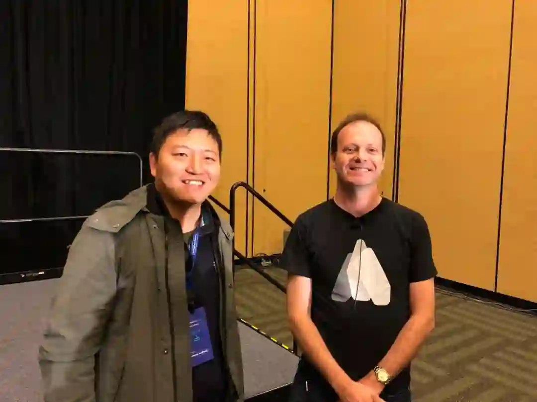 WebX 无论是在开发还是部署上,都属于相当笨重的一套框架,而几乎是同年起步的 Spring 则轻巧灵活了许多。2017 年,我去湾区参加 Spring 大会,还有幸与 Spring 之父 Rod Johnson 要了合影,只是那会他已经淡出了 Spring 社区。(Spring 的编年史见附录 1)