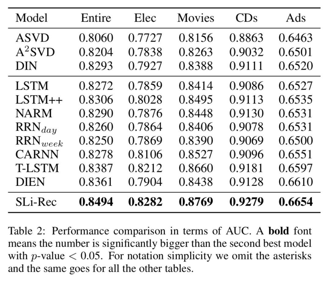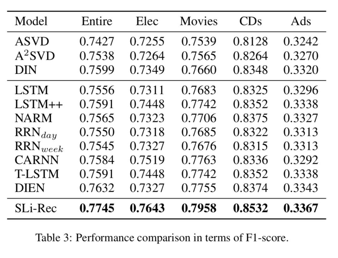 对比 baseline 表 2 和表 3 分别显示了不同模型在 AUC 和 F1 得分方面的总体表现。ASVD、A2SVD 和 DIN 是在没有序列机制情况下建模的,而其他模型则有序列组件。A2SVD 和 DIN 优于 ASVD,这表明为项目分配重要性评分是有益的。