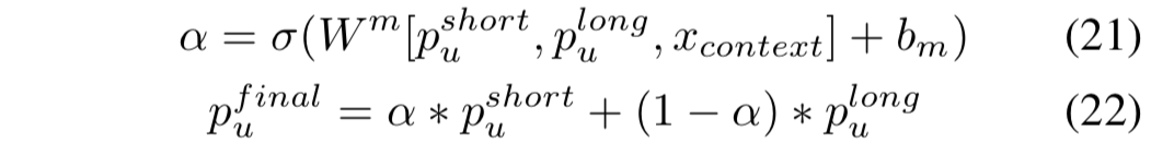 短期和长期部分都有优点和缺点。有必要融合一下这两个部分。我们设计了一种信息融合的自适应方法,而不是使用简单的方法,例如 p(final)(u)=p(short)(u)+p(long)(u)。设计的动机是哪个组件应该扮演更重要的角色取决于具体的上下文,比如什么时候(如果在之前的行为之后很快发生下一步行为,那么短期的偏好可能更具信息量)和什么信息(移动电话等某些 item 是从长期偏好中更好地推断,而从短期信息中更好地推断某些类别,如移动配件)。因此,动态信息融合是有益的,我们提出了以下基于注意的自适应融合方法: