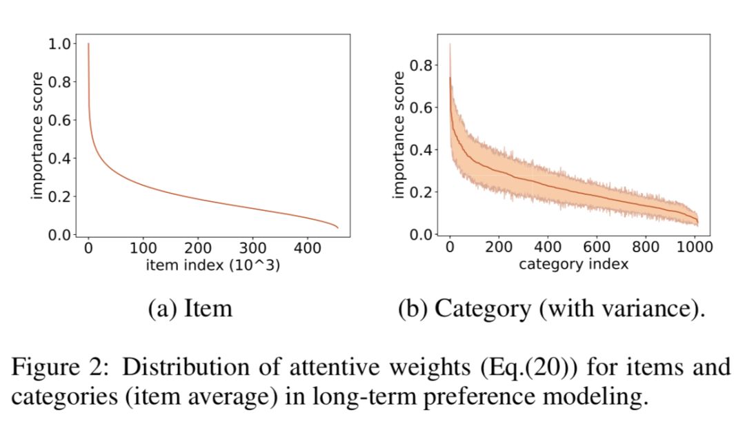 长期偏好部分的注意力机制 为了验证等式(18)是否能够学习不同 item 的区分重要性分数,我们在整个数据集中输出等式(20)中 item 的权重值。为了更好地说明,对于每个类别,我们最多抽样 1000 个 item,忽略少于 100 个 item 的类别。我们根据 item 的标准化重要性得分对其进行排序,并绘制图 2a。对于每个类别,我们计算该类别下所有 item 得分的平均值和方差,并绘制图 2b(得分按 1e-5 进行缩放)。我们可以观察到,item 被分配有区分性的分数,很少 item(少于 2%)被分配一个大于 0.5 的标准化的分数。