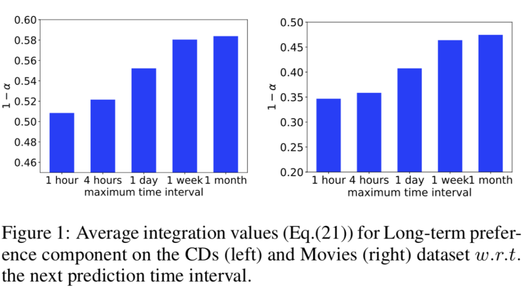自适应融合的有效性 表 5 展示了等式(22)中α的各种选择。α=0 和α=1 分别表示仅使用长期或短期组件。α=fixed 意味着我们根据经验为每个数据集搜索一个固定的最佳值(类似于两个组件的端到端集成)。我们观察到,短期组件总是明显优于长期组件,因此有时这两个组件的简单组合甚至比短期组件更糟糕。自适应融合机制是必要并且有效的。为了直观地了解α将如何随上下文变化,我们根据用户最后一次行为的时间间隔拆分测试实例。例如,1 小时意味着我们想要预测的行为发生在用户最后一个行为之后的 1 小时内。图 1 显示了结果。有一个明显的趋势,即长期组件的重要性随着时间间隔的增加而增加,这符合我们的假设。