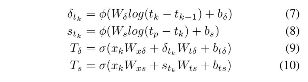 为了解决时间不规则问题,我们修改了 LSTM 中的门控逻辑,使其对时间变化敏感。我们介绍两个时间感知特征,即时间间隔特征δ(tk) 和时间跨度特征 s(tk),如下所示:
