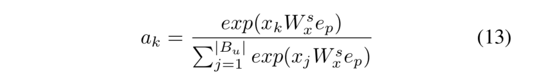 与注意力的协作过滤相似,a(l)(j) 是行为 j 的加权分数。我们假设并非所有行为都有相同的贡献,因此,为相关的信息较强(信息较差)的行为分配较高(较低)的权重是有意义的。权重得分计算如下: