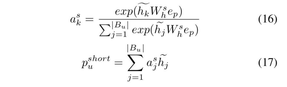 不是使用最后一个隐藏状态作为用户表征,即 p(u)(short)=h(~)(k),而是我们通过所有隐藏状态的加权平均值来定义用户的短期偏好:
