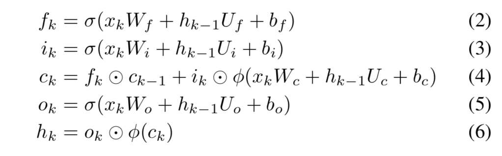其中 W*,U* 为可训练参数,D 为 RNN 中输入嵌入层和隐藏层的维数(为便于记法简单,我们假定维数 k 的大小相等)。f(k)、i(k)、o(k) 分别表示遗忘门、输入门和输出门。c(k) 表示 cell 状态,x(k) 表示第 k 个 item 的输入嵌入,而⊙表示 element-wise 的乘积。通常,σ是 sigmoid 函数,而φ是 tanh 函数。