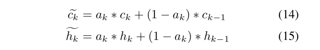 其中 e(p) 表示要进行预测的 item 的另一个嵌入向量,我们称之为预测嵌入,与输入嵌入向量 x(p) 不同。注意力得分 a(k) 根据目标 item 决定哪些 item 应该被重点关注或忽略。我们利用这些分数来调整 cell 和隐藏状态: