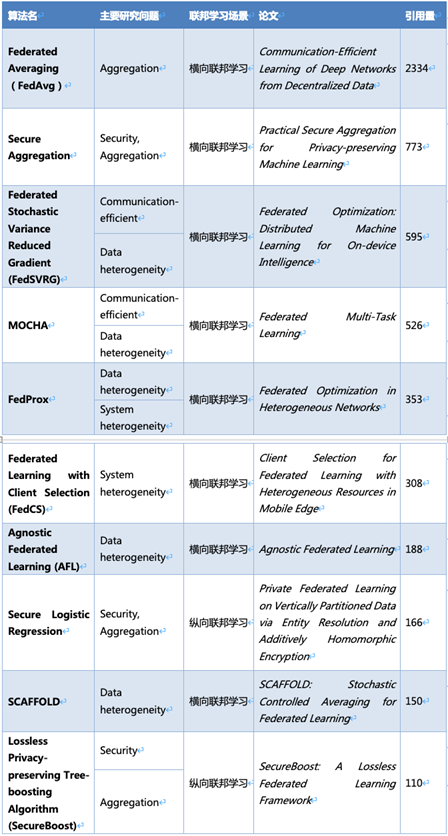同时,报告还给出了联邦学习的十大算法,并对联邦学习领域高被引论文 TOP 10 进行了解读。