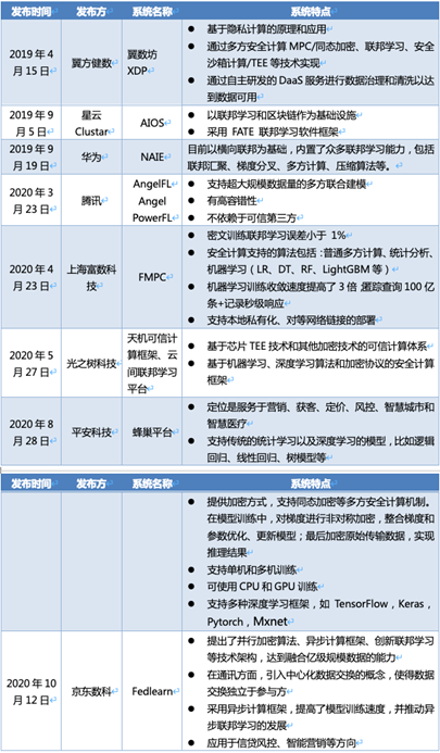 非开源的联邦学习框架基本上都是由企业推出的,主要集中发布于 2019 至 2020 年期间,目前主要有腾讯的 AngelFL 联邦学习平台、京东数科 Fedlearn 平台、平安科技研发的蜂巢联邦智能平台等。