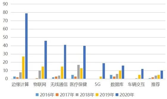 近 5 年联邦学习在边缘计算、无线通信、医疗保健、数据库以及推荐方面的应用研究热度也呈现出逐年上升的趋势。