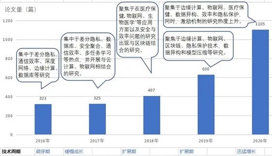 近日,清华大学人工智能研究院知识智能中心和清华—中国工程院知识智能联合研究中心和智谱 AI 联合发布了《2021 联邦学习全球研究与应用趋势报告》(以下简称“报告”),报告从科研论文、专利、书籍、行业应用、学者地图与画像、技术发展趋势等多个角度,全景展示和分析了联邦学习技术自从 2016 年被提出以来至 2020 年的重要进展,并展望了该技术的未来发展方向与前景。