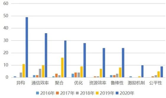 在安全隐私方面,差分隐私、多方计算、恶意攻击、同态加密和容错一直是研究热点并且其热度总体逐年上涨。