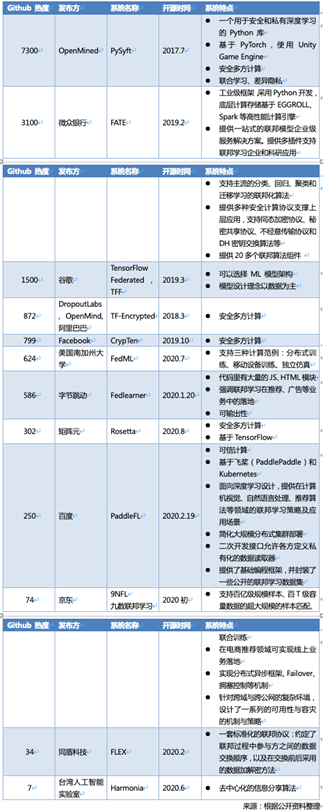 目前,市面上有许多来自于科研机构或企业的关于联邦学习的开源工程。报告通过 AMiner 数据库中的新闻数据,按照开源与非开源两类,分析梳理了国内外主要的联邦学习相关系统框架,并列出了 10 个国内外开源联邦学习框架。