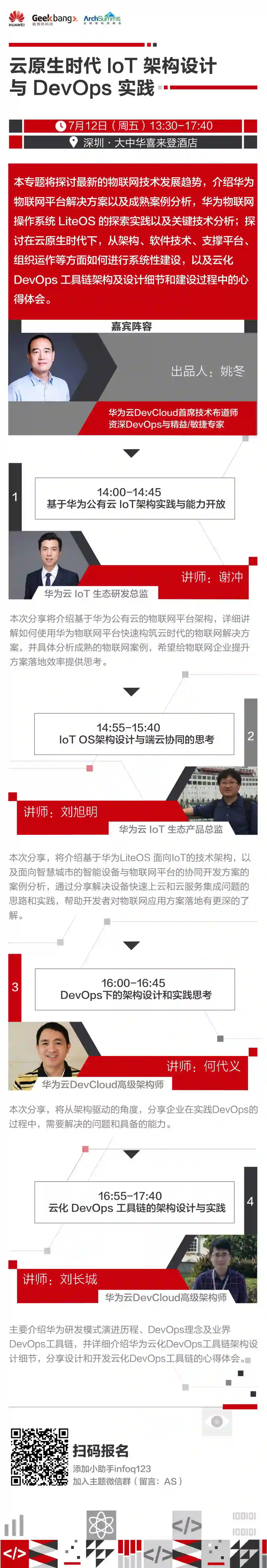 ArchSummit 全球架构师峰会将于 2019 年 7 月 12-13 日 在 深圳 举行。此次峰会特别设置「云原生时代 IoT 架构设计与 DevOps 实践」解决方案专场。本次专场将解读最新的物联网技术发展趋势,介绍物联网平台解决方案以及成熟案例分析,探讨在云原生时代下,从架构、软件技术、支撑平台、组织运作等方面如何进行系统性建设,并分享云化 DevOps 工具链架构设计和建设过程中的心得体会。