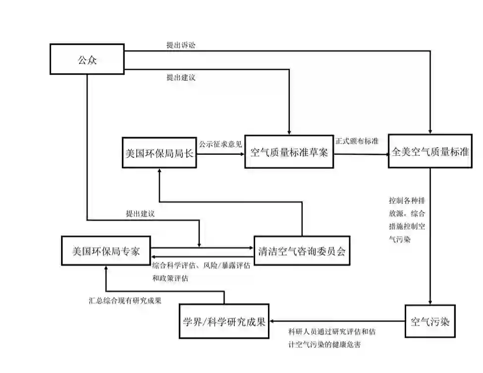 同时,公共卫生的科研人员也密切跟踪人群的健康情况,通过流行病学调查和统计模型,研究现定的空气污染是否对人体健康仍然有危害。相关结果被发表在各大学术期刊上。每隔五年,会有专门的“清洁空气咨询委员会”和环保部相关的专家搜集发表的学术结果,撰写并反复审议科学评估、风险/暴露评估和政策评估等报告,并听取公众意见,最终向环保局局长推荐新的标准。环保局局长公布空气质量标准草案,再经过听证会和讨论等既定程序,确认现有空气质量标准是否合适,最后再发布新的空气质量标准,有时候甚至会经历激烈的法庭诉讼 。如此循环(图 1)。