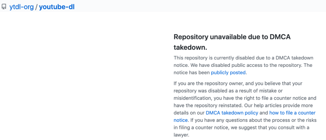 所以,GitHub 将 RIAA 的信函视为 DMCA 下架通知,并禁用了 youtube-dl 以及信函中提到的多个相关库。