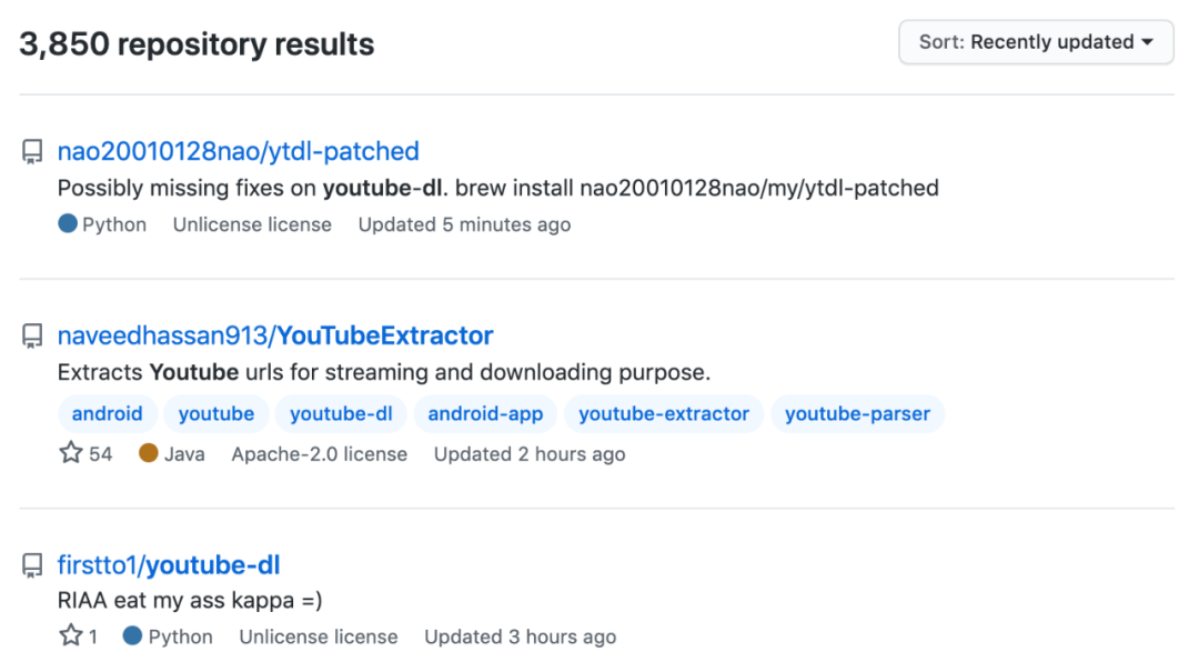 目前,在 GitHub 上搜索「youtube-dl」可以找到 3800 多个结果,其中许多是最近更新的。