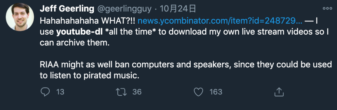 既是开发者又是油管博主,同时使用 youtube-dl 存储自己视频的 Jeff Geerling 对这件事感到愤慨: