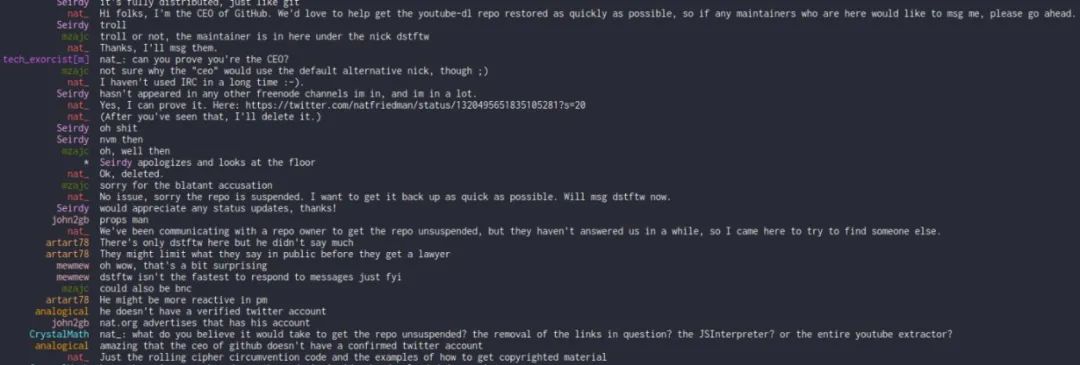 Nat Friedman 积极联络 youtube-dl 的开发者,以期帮助他们重新恢复项目。此前,Nat Friedman 也出现在了 youtube-dl 的 IRC 频道。